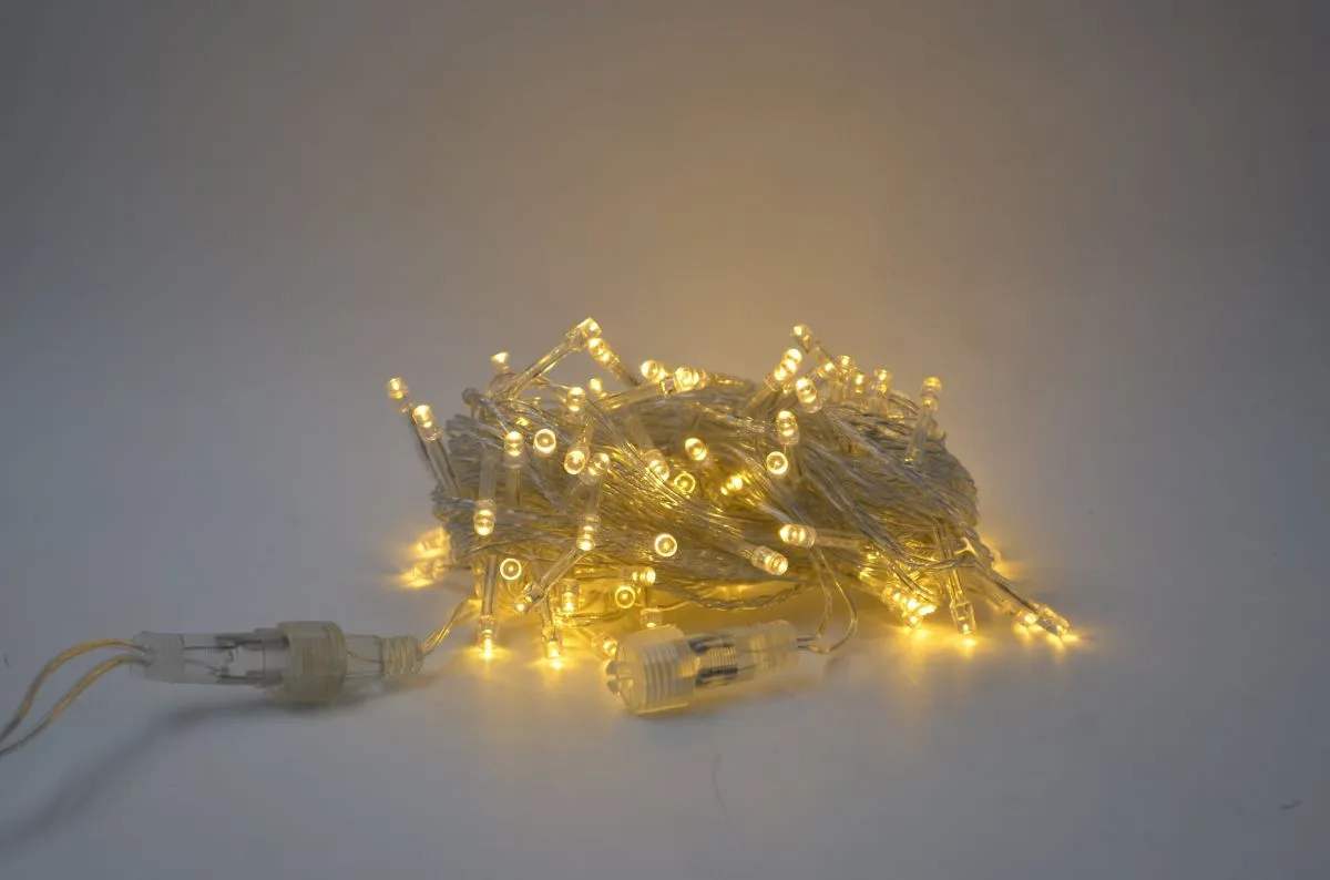 Cordão Pisca Externo Fixo 100 Led Branco Quente - Fio Cristal Macho e Femia 10 metros